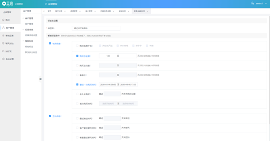 传统的打标动作,完全依赖员工,批量管理标签难以实现。艾客的智能打标功能,实现了商家通过客户的电商信息、互动信息、自定义字段信息作为条件筛选出客户人群包,并给这批客户自动打上标签。
