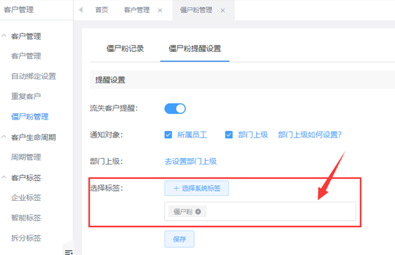 借助艾客SCRM梳理僵尸粉,当客户删除员工后,给这个客户自动打上“标签”,标签由商家自定义。通过该功能可以帮助员工快速找到自己的僵尸粉并清除,大大提高了员工工作效率。