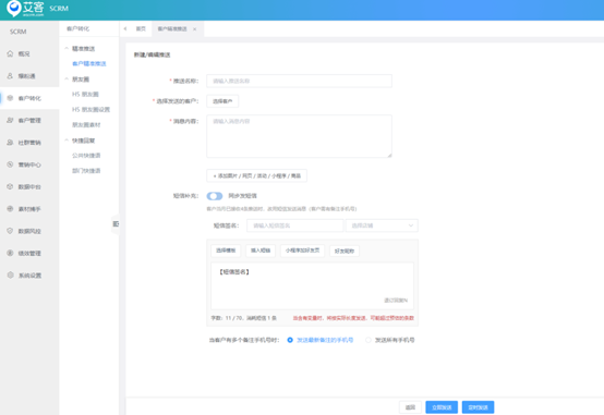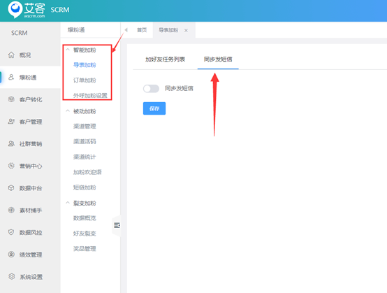 艾客scrm接入短信系统,设置好短信模板后,可应用在以下几个场景 1.1、导表加粉、订单加粉、外呼加粉,开启短信通知后会对需要加粉的手机号先进行短信群发,可以有效提升加粉的通过率。