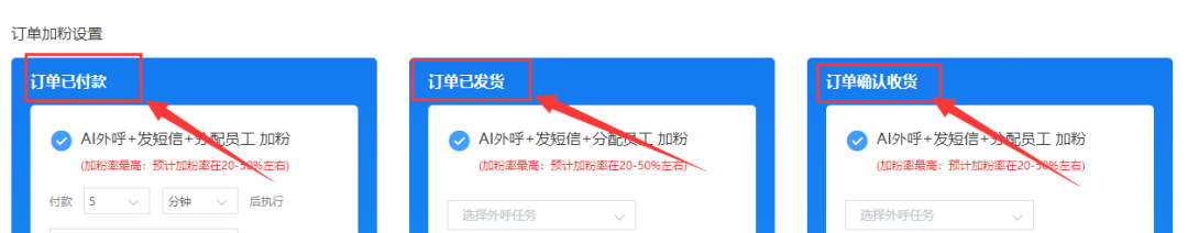 - AI外呼+发短信+分配员工加粉:是指有新的订单收货手机号时,会导入手机号进行AI智能外呼,用户接电话并确定有加好友意向时,接着会给有意向的手机号发送商家指定的短信内容,通过双重触达后再分配给选中的员工,员工会收到实时提醒,要求员工实时去添加当前这个手机号为好友.