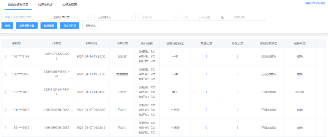 仅分配员工加粉:是指新的订单收货手机号时,会将导入的手机号分配给选中的员工,员工会收到实时提醒,要求员工实时去添加当前这个手机号为好友。