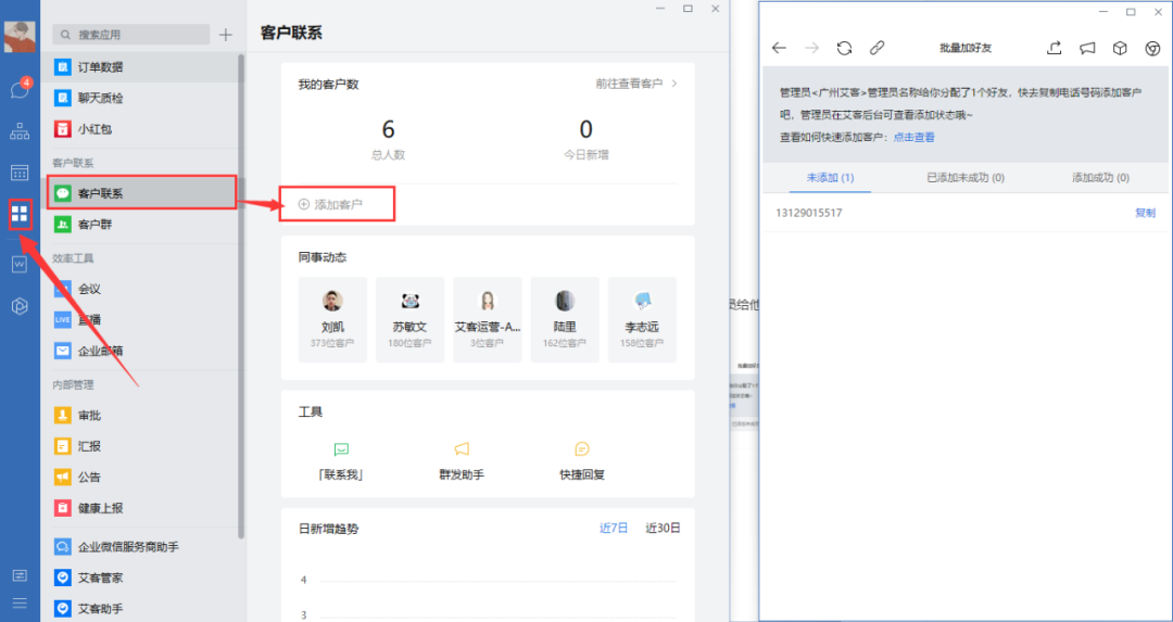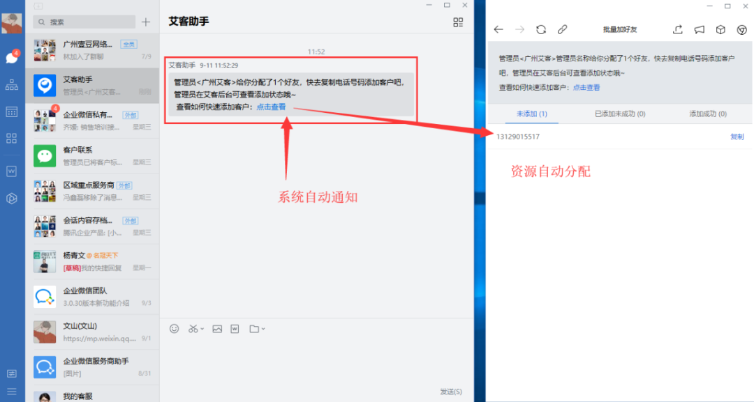 在任务时间段内,系统会执行加粉任务,将有意向的手机号通过 “艾客助手” 通知选中的员工。