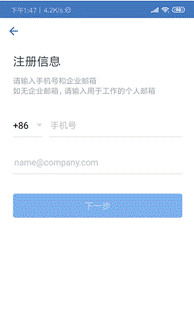 (3)第一次使用,这里会让你输入手机号以及工作邮箱进行注册,输入相应信息,点击【下一步】