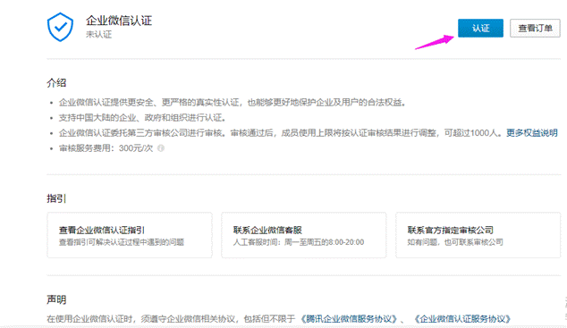3)选择“企业微信认证”,需要缴纳300元审核费用