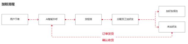 l AI外呼+发短信+分配员工加粉:是指有新的订单收货手机号时,会导入手机号进行AI智能外呼,用户接电话并确定有加好友意向时,接着会给有意向的手机号发送商家指定的短信内容,通过双重触达后再分配给选中的员工,员工会收到实时提醒,要求员工实时去添加当前这个手机号为好友