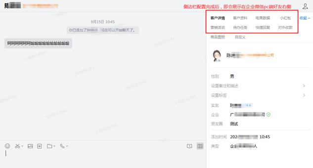 当员工和外部联系人聊天时,在聊天窗右侧打开的功能应用页面。可以将企业的功能配置到侧边栏,方便员工获取和操作客户信息;