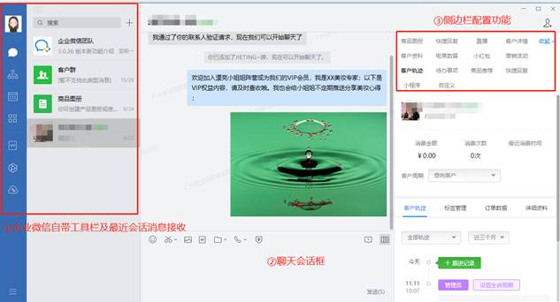 ①企业微信自带:商品图册、快捷回复、直播、小程序、客户详情(可自定义选择停用/启用,停用后则不会显示在侧边栏位置;操作路径:企业微信后台-客户联系-聊天工具-聊天工具栏管理-编辑-停用)