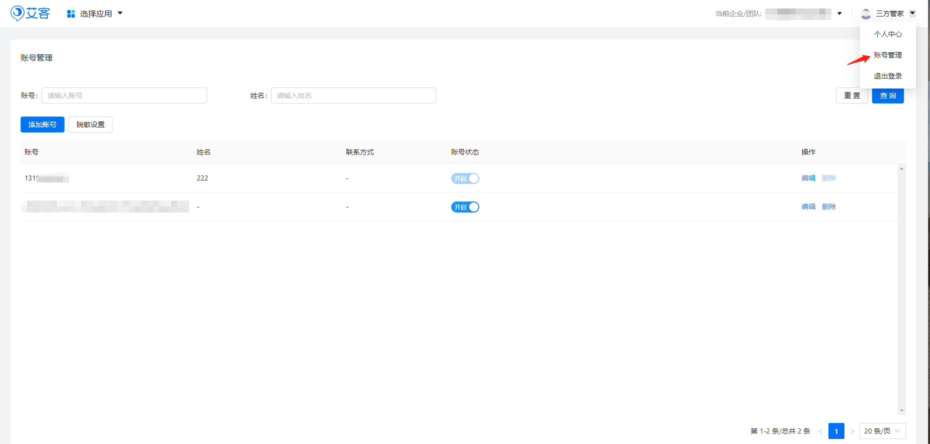 管理员账号登录后,在系统右上角点击【账号管理】页面