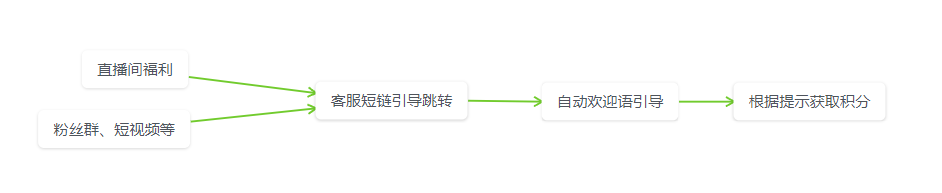 直播间主播口播说明准备了福利活动,所有直播间直接下单的订单都可以去兑换积分,具体怎么兑换积分,点击x号链接去联系客服。通过平台客服的自动引导,发送给咨询的粉丝加企微的跳转短链,在此可以通过自动引导和x号链接的内容相一致,增加粉丝加粉率;