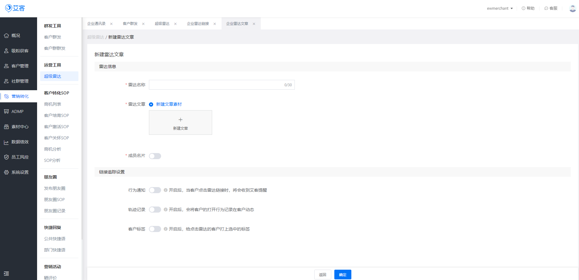 艾客SCRM的超级雷达功能,是管理员在艾客后台创建的带追踪功能的雷达链接或者雷达文章,企业员工给客户发欢迎语的时候,就可以把带有追踪功能的雷达链接、雷达文章一同发给客户。