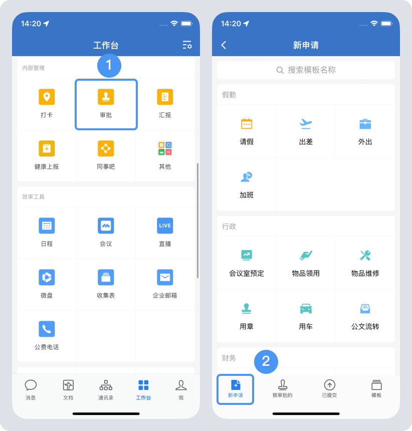 PC端:登录PC端企业微信后,在“工作台”——“审批”——“发起申请”
