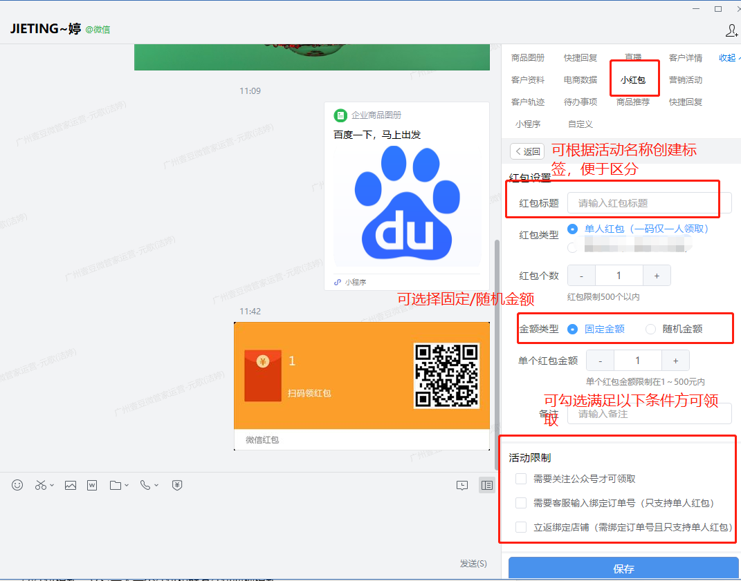 艾客的【小红包】功能,可以让企业在与客户沟通的过程中,进行适当的红包营销,并且该红包发送直接对接微信支付接口。
