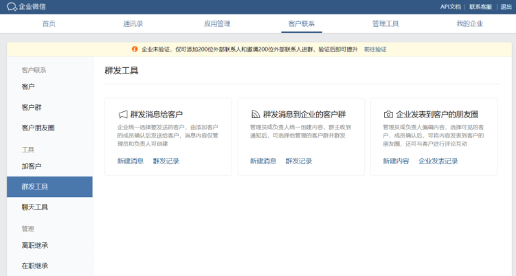 由企业编辑好的朋友圈内容,需要企业微信管理员在企业微信管理后台,通过“客户联系——群发工具——企业发表到客户的朋友圈”,来进行新建内容,内容可以包含文字、图片、视频、网页等形式,内容建完之后就可以分配给企业成员进行发送。当企业成员接受到发圈任务时,直接点击就能发表到自己的企业微信朋友圈。