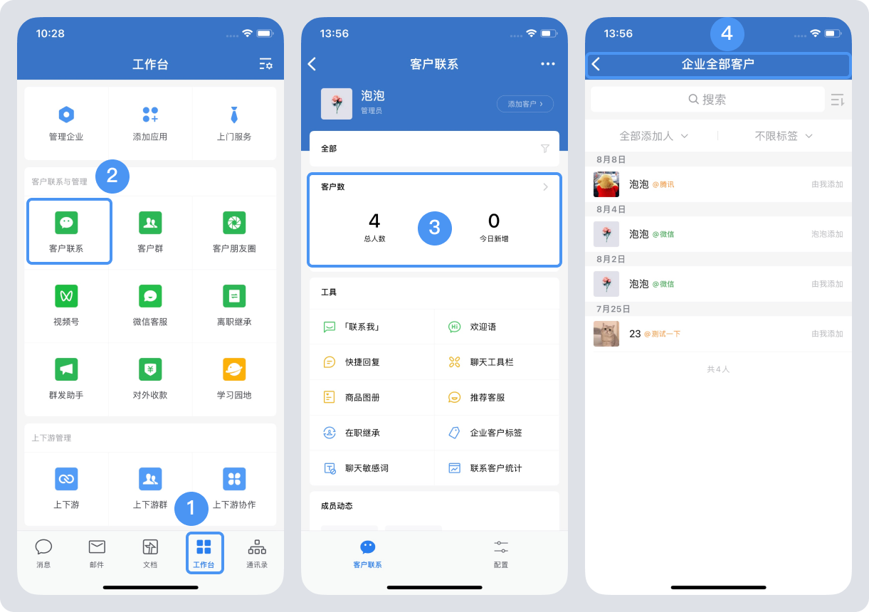 手机端查看企业客户资料步骤:企业微信管理手机登录企业微信,“工作台”——“客户联系”——“客户数”——“企业全部客户”。