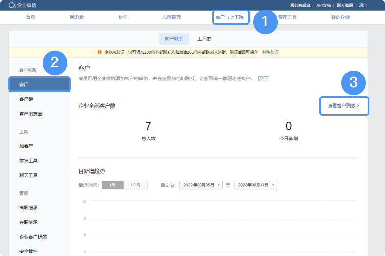 企业微信后台查看企业客户资料步骤:企业微信管理员登录企业微信管理后台,在“客户与上下游”——“客户”——“查看客户列表”,就可以查看所有的企业客户了。