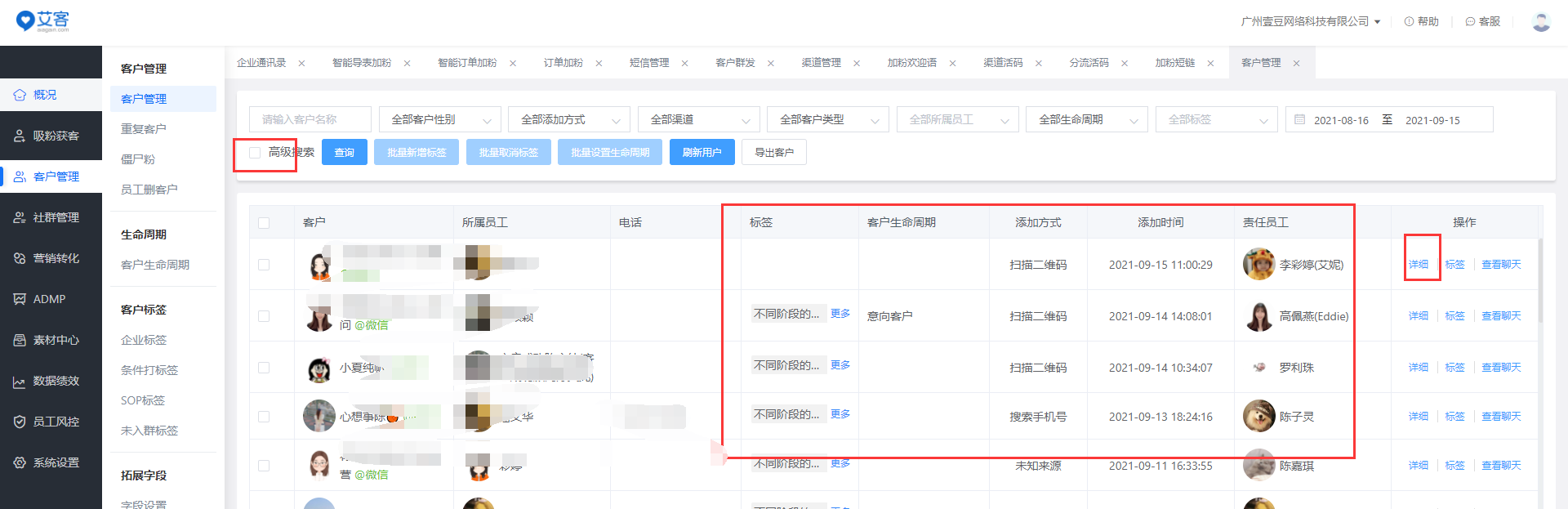 在导出客户资料上,企业也可以使用艾客SCRM系统的客户管理功能,此功能不仅能查看到企业微信所有的客户信息,比如客户基本信息、客户标签、客户购物记录、是否产生复购等,并且也支持导出客户,企业可以导出全部的客户,也可以选择导出部分客户资料。