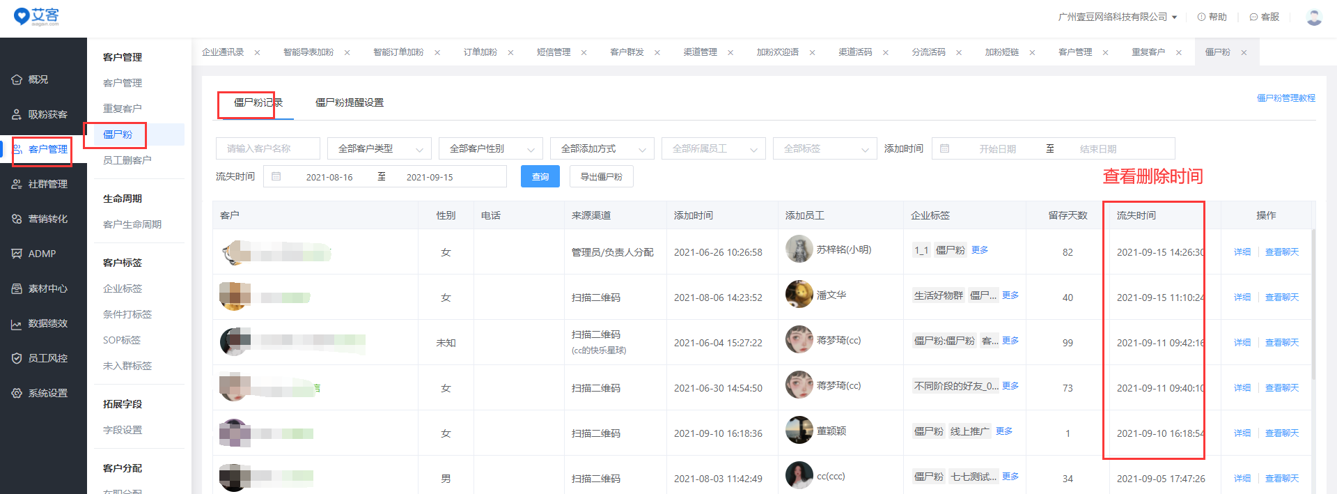而且,艾客的【僵尸粉】功能可以把客户删除员工的数据全部记录下来。企业可以通过艾客后台进行查看。