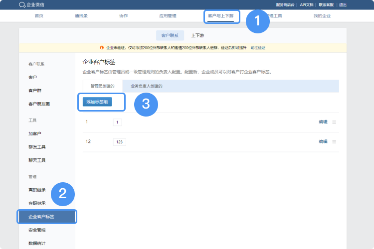 企业微信只支持企业微信管理员进行添加和设置,企业微信管理员可以在企业微信管理端和手机端进行添加“企业标签”,添加完成后企业成员方可给各自手上的客户打上企业标签。在【管理后台->客户与上下游->客户联系->企业客户标签】进行对企业标签的设置。