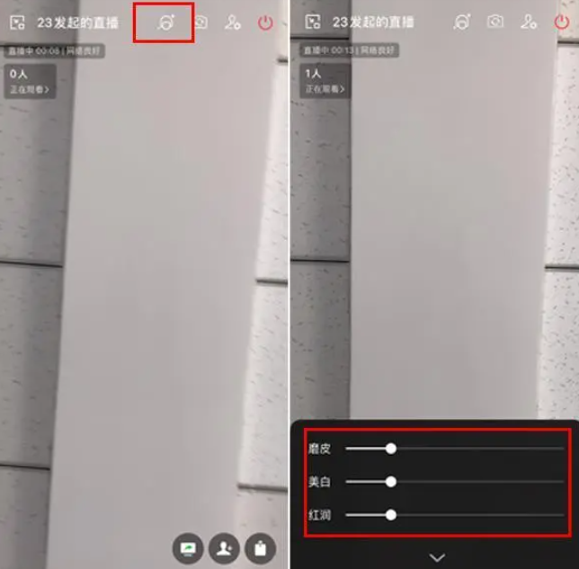 手机端开美颜步骤:进入直播间后,点击右上角的第一个图标,会在底部出现磨皮、美白、红润三个选项可调整美颜程度。
