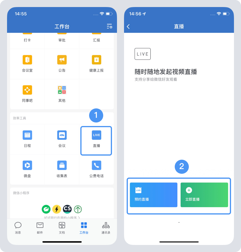 登录手机端企业微信,在“工作台”——“直播”——“立即直播”就可以发起直播了。直播发起后,可以分享给好友或者分享到社群中。