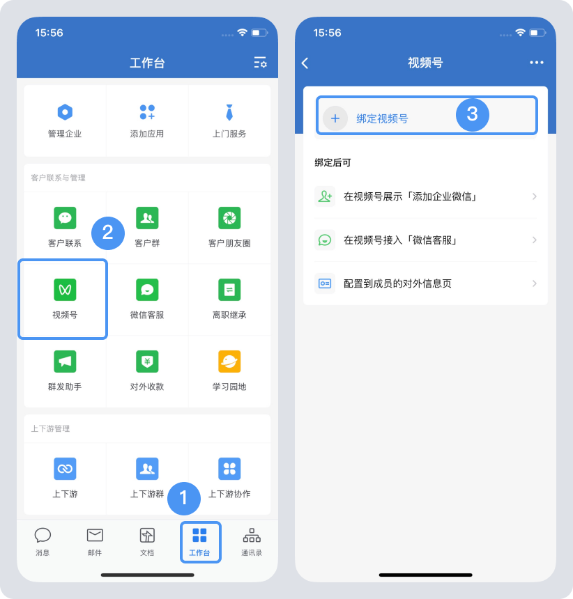 (1)企业管理员可以登录企业微信手机端,在工作台找到视频号入口,输入需要绑定的视频号名称,再通过管理员扫码确认,就能完成绑定。具体操作如下图: