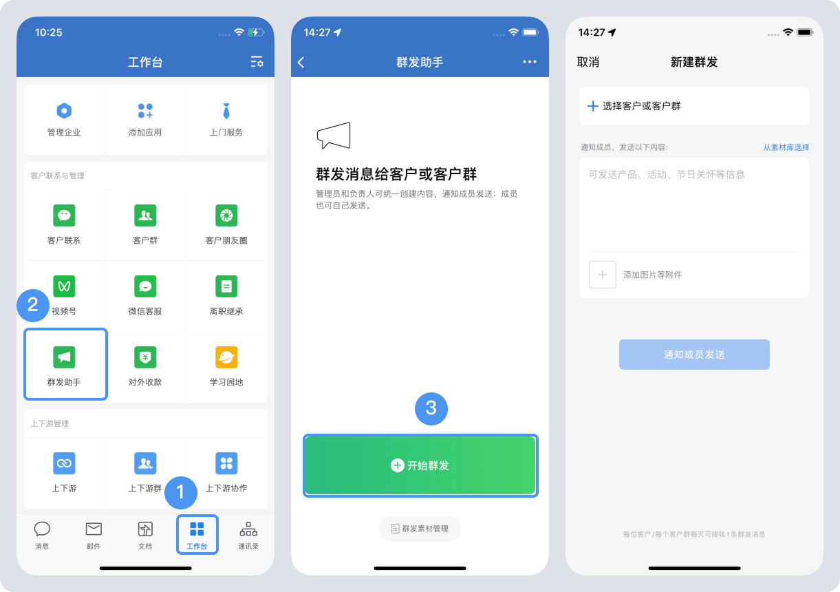 手机端:登录手机端企业微信,在“工作台”——“群发助手”——“开始群发”。