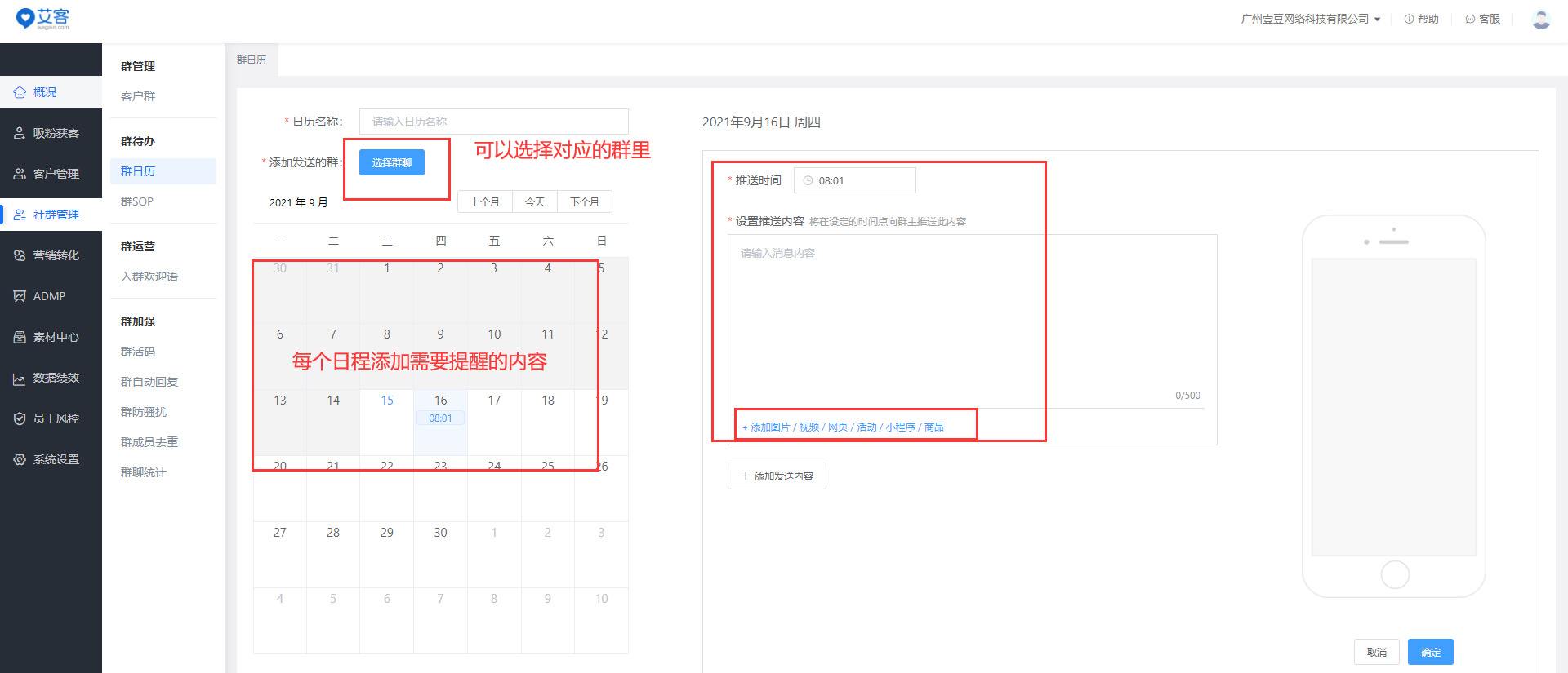 还可以搭配群日历功能一起使用,群日历功能是达到指定时间后通知对应的员工去执行对应的任务,它能让群SOP推送时间更加精准,企业可以对所推送的内容具有一个清晰的时间线认知。