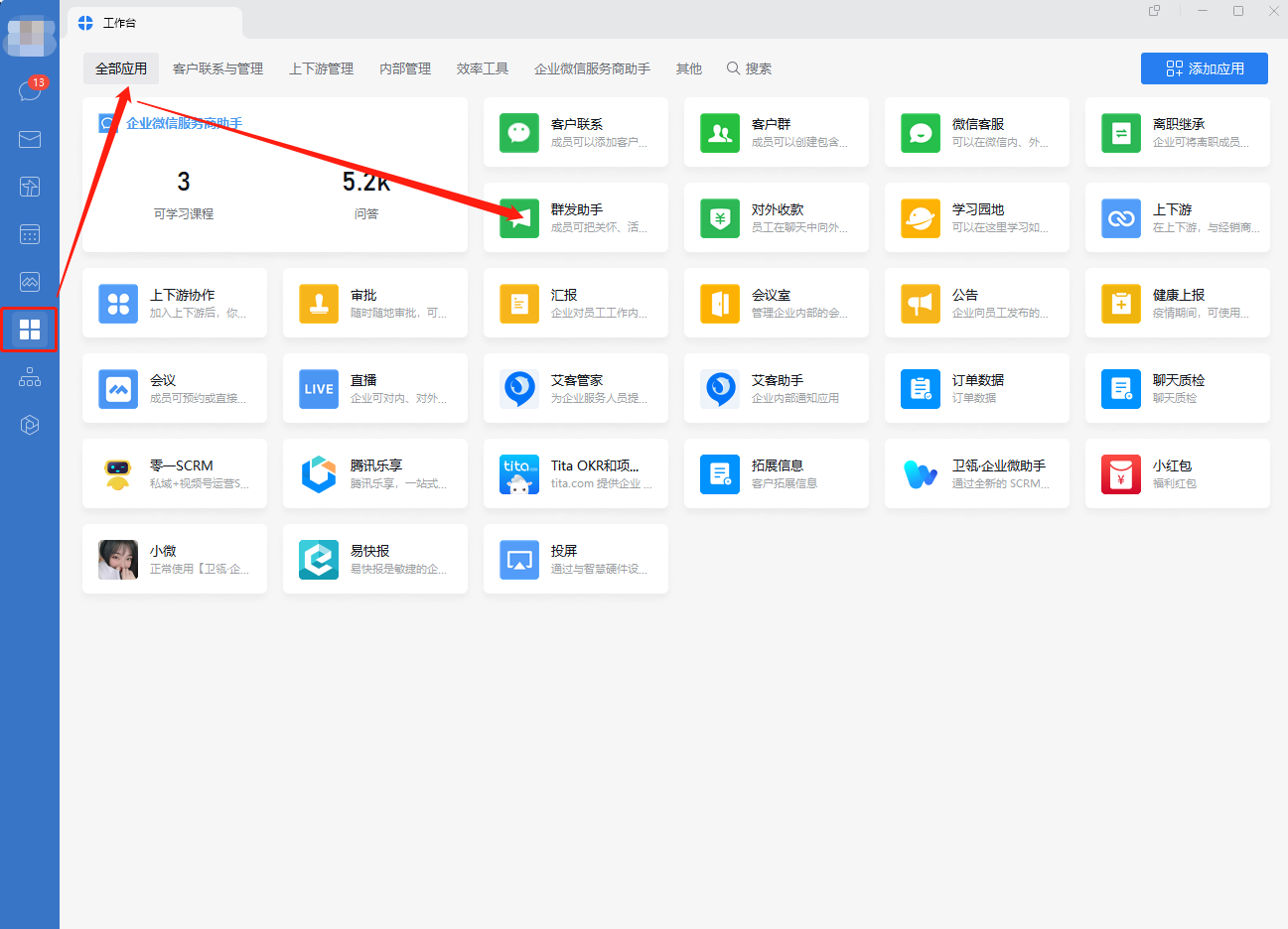 一、打开企业微信,点击【工作台】—【全部应用】—找到【群发助手】