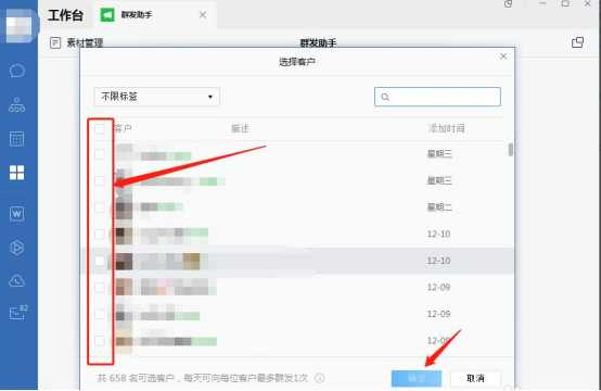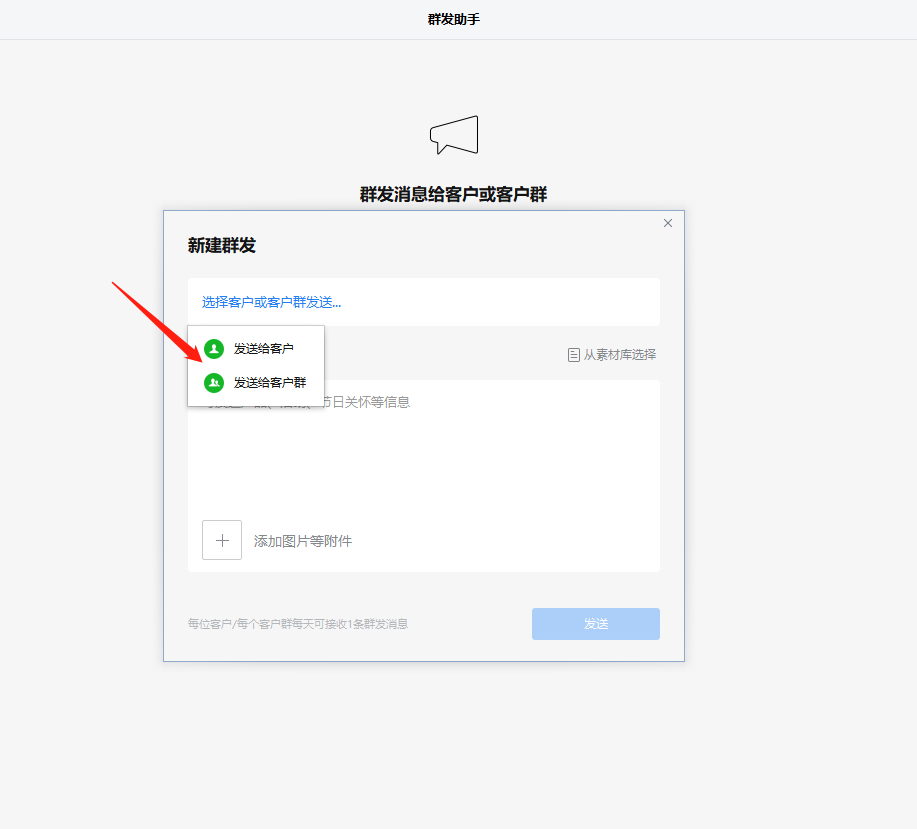 点击【选择客户或客户群发送】-再点【发送给客户】,勾选客户,点【确定】