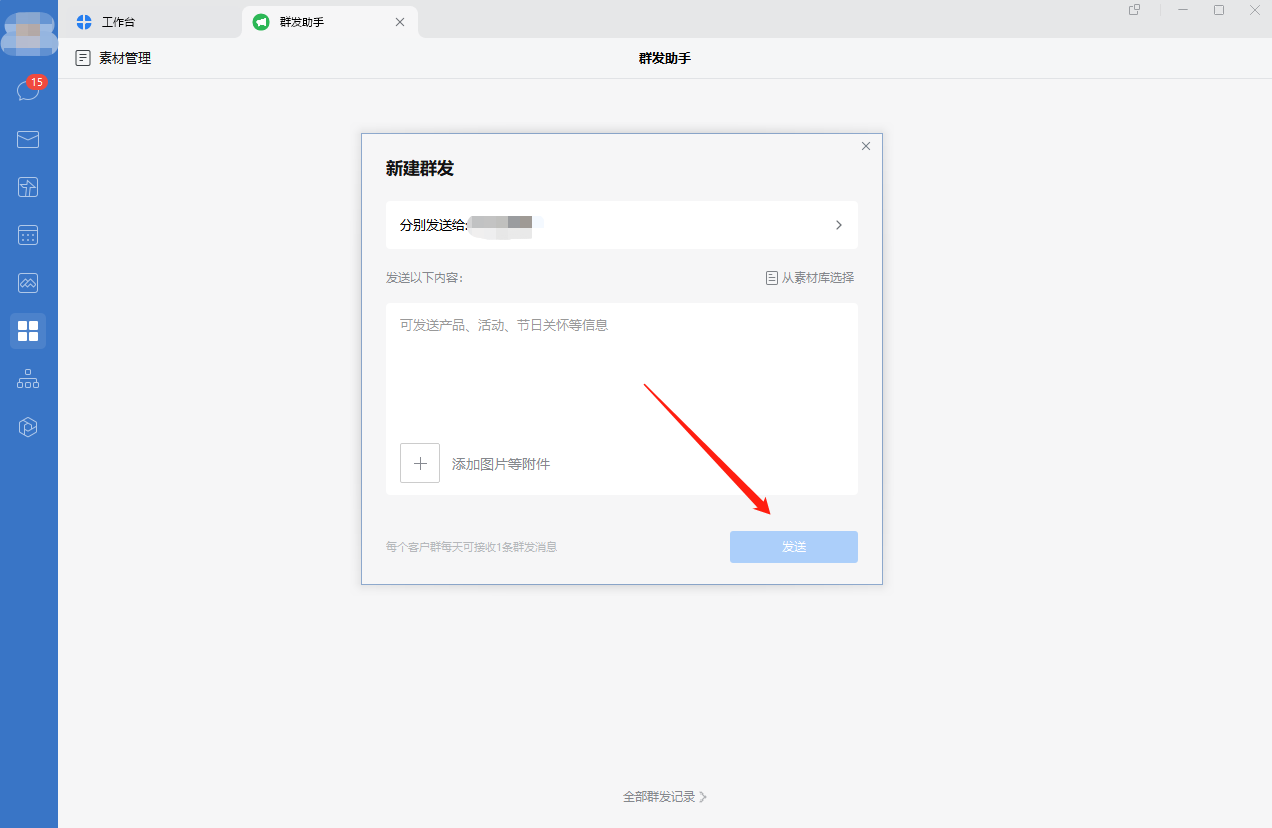 企业群发:在企业后台“客户联系”里的“群发助手”中,可以直接设置想要发布的内容,发送给客户。发送的客户量可以选择发布至全部,也可以单独选部分客户。企业管理员在对客户进行群发时,管理员需要对应客户添加的员工同意之后才可进行操作,一次最多可以发送10000人,一个客户每周只能收到一次消息。