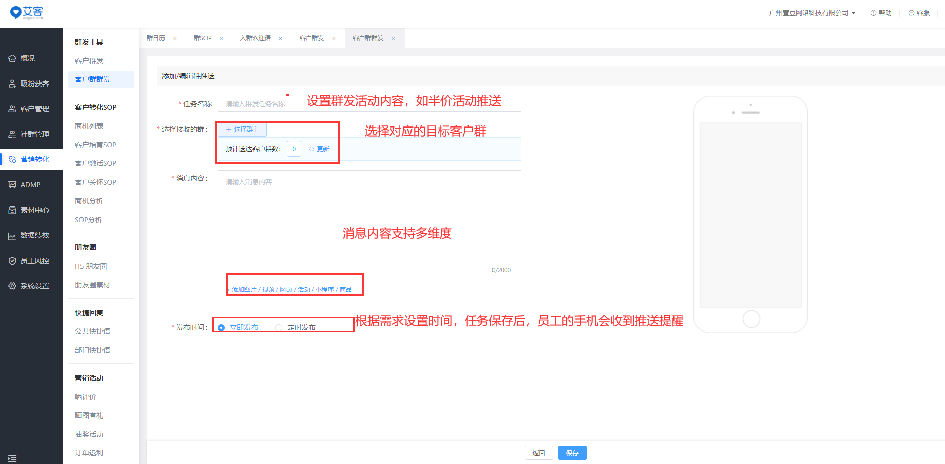 企业微信同样也可以给客户群群发。如果企业对客户群群发具有更细致的要求,小艾推荐可以使用艾客scrm系统的客户群群发功能,群主或员工可以根据制定的群给客户群即刻或定时群发消息,可以实现快速的营销触达。