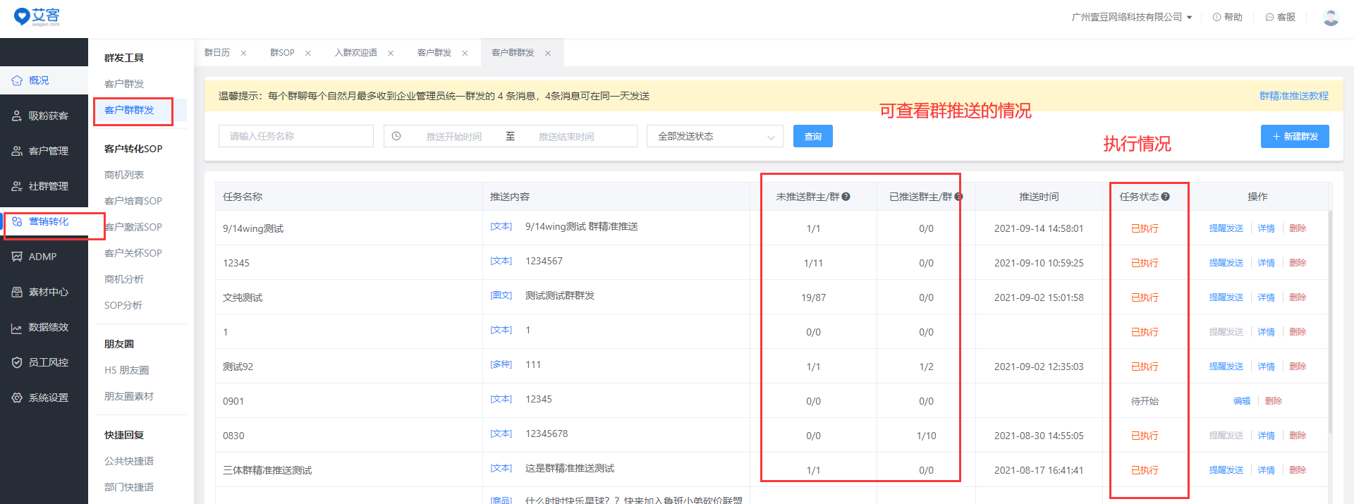 使用艾客的客户群群发功能,企业精准推送任务搭建成功后,会先推送任务到对应群主员工的企业微信,需要员工同意后才可发出,也可以通过后台查看到员工的执行情况,提高运营效率。另外需注意,每个客户群每天只能接收1次群发消息,包含企业级与员工级群发方式,超过次数限制的客户群消息将会被忽略。