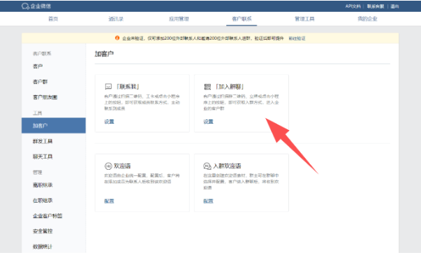 企业微信自带群活码功能,管理员进入企微管理后台,根据操作路径【客户联系】—【加客户】—【加入群聊】—【设置】,就能选择自带拉群方式,创建入群的企微二维码,客户扫码就可以进入群聊。