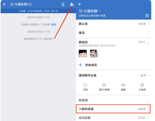 第二步,在企业微信群聊中配置创建好的欢迎语。先打开群聊,点击右上角箭头前面的图标,找到入群欢迎语添加到群聊中。