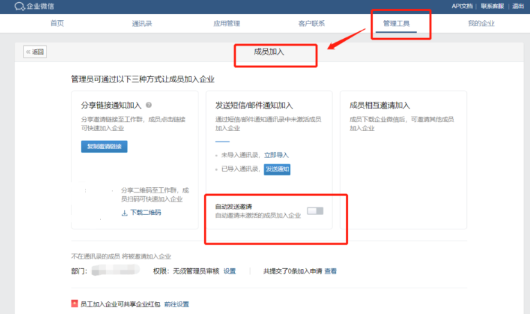 企业微信自动邀请好友的出现,有一种可能是企业微信管理员没有关闭自动邀请好友的选项。在企业微信管理后台的“管理工具——成员加入——自动发送邀请”,企业微信管理员可能打开了此功能。