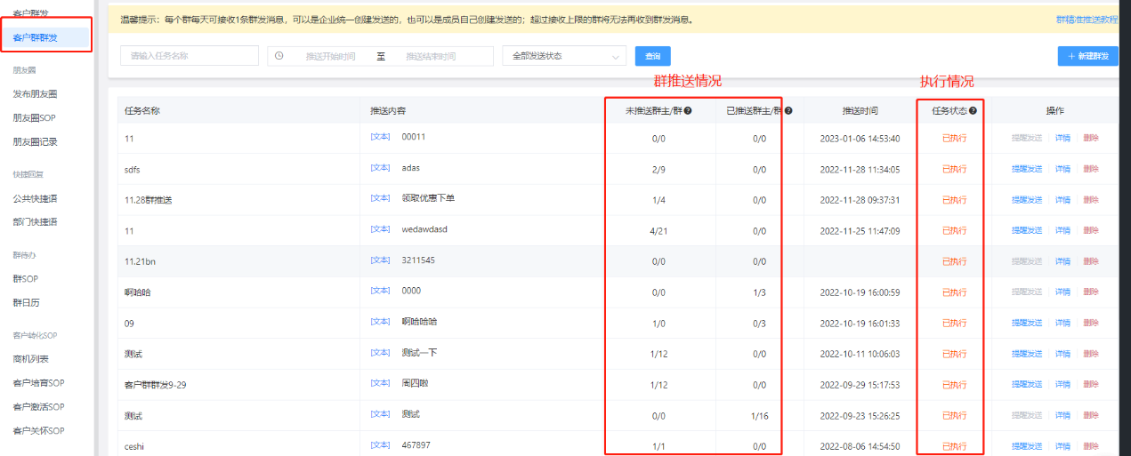 2、每个客户群每天只能接收1次群发消息,包含企业级与员工级群发方式,超过次数限制的客户群消息将会被忽略。