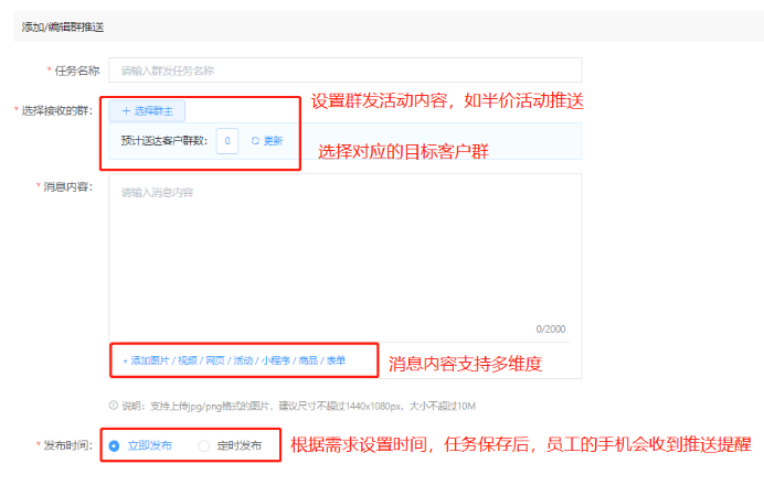 不仅如此,此群发功能还支持定时群发,企业在设置客户群群发任务时,需要设置群发活动内容、选择对应的目标客户群、设置群发消息内容、发布时间选择定时发布即可,企业可以根据需求设置时间,当群发任务保存之后,员工的手机会收到推送提醒。