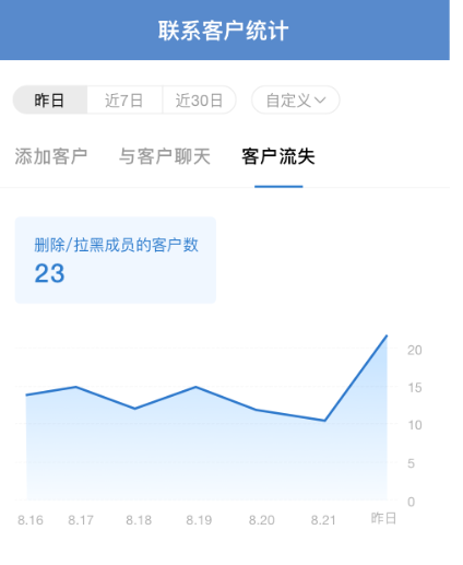 使用此功能可以从时间维度进行选择,可以选择昨日,也可以选择近7日,近30日或者自定义时间查询客户流失数据。