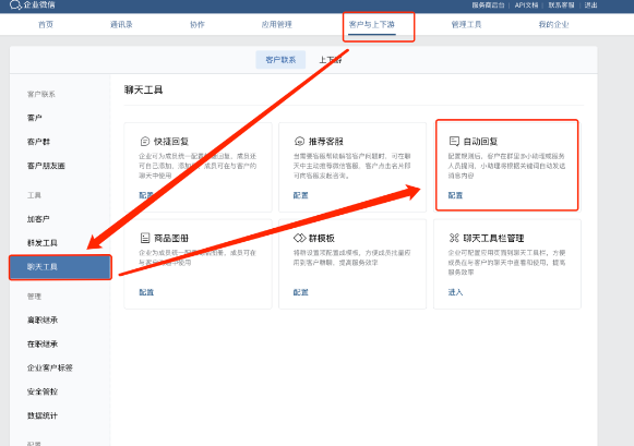 首先登录企业微信管理后台,选择【客户与上下游】—【聊天工具】—【自动回复】,点击下方配置即可进行自动回复规则的创建。