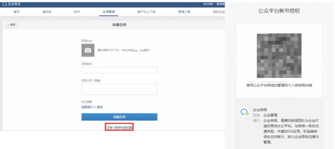 怎样关联小程序,可以根据以下步骤:在“应用管理”点击“创建应用”——“已有小程序快速创建”,之后页面会自动跳转到进行账号授权的页面,企业微信管理员扫码授权即可。