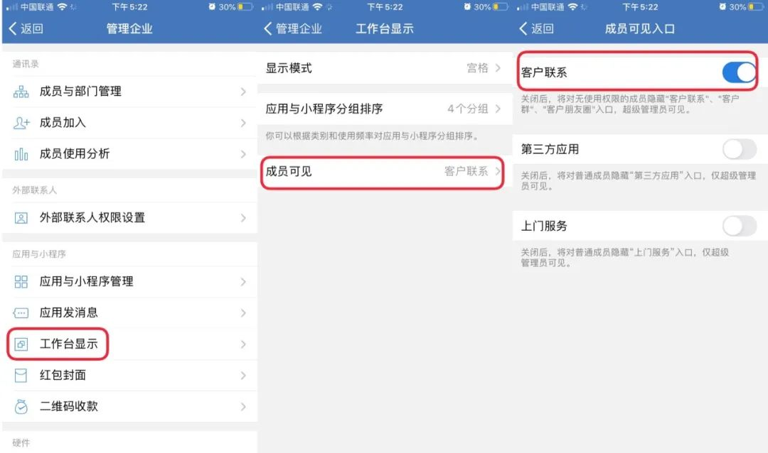 企业微信管理员如果没有开通入口,可以进去企业微信手机端,依次点击“工作台”——“管理企业”——“工作台显示”——“成员可见”,就可以看到“客户联系”是是开启还是关闭状态了。