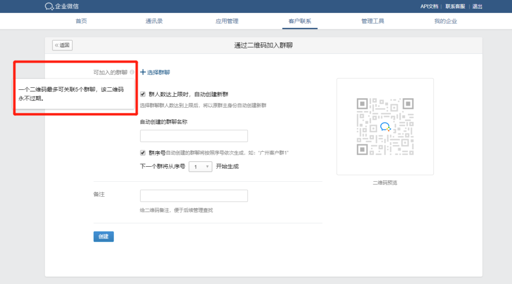 企业微信的群活码功能就支持自动建群。企业在企业微信后台创建一个群活码,它永远不过期,在单个群聊里面的人数满了之后,系统就会自动创建新的群组让客户进入,不需要企业手动建群。