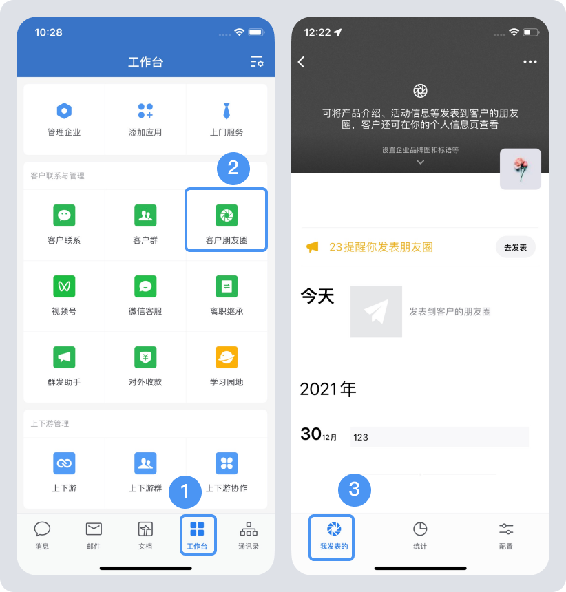 1、企业成员查看历史朋友圈步骤:登录手机端工作台,在“客户联系与管理”中选择“客户朋友圈”,就可以查看已发表的朋友圈内容记录了。