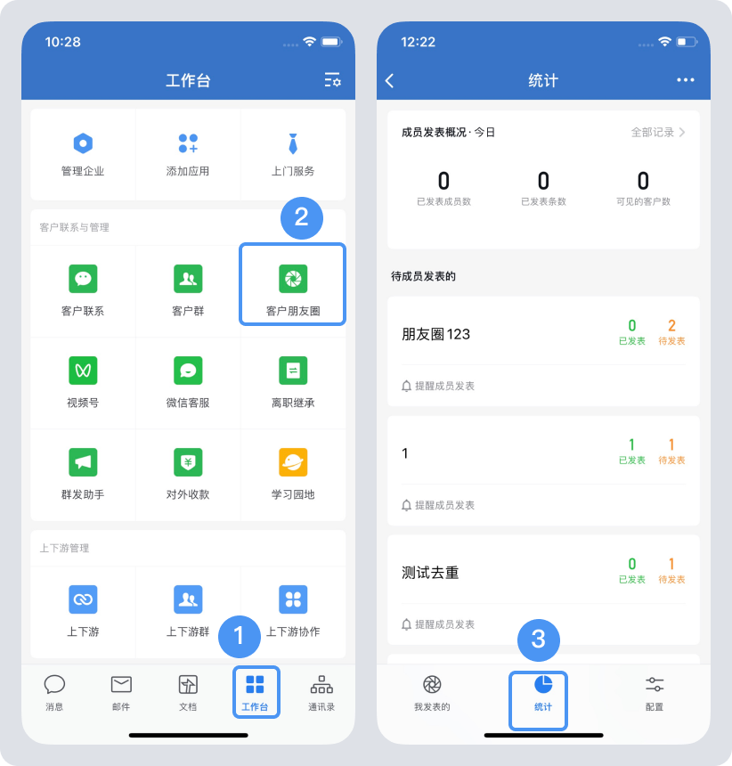 3、管理员还可以通过“工作台”——“客户朋友圈”——“配置”——“统计”,查看企业成员发表企业微信朋友圈概况和待成员发表的朋友圈。