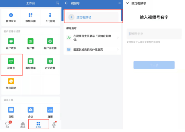 目前企业微信可以绑定视频号,绑定后,视频号成员对外信息可以展示出来.具体操作路径是这样的,只需管理员登录企微手机端,在工作台页面找到“视频号”入口进入,然后输入绑定视频号名称,最后通过管理员确认即可。