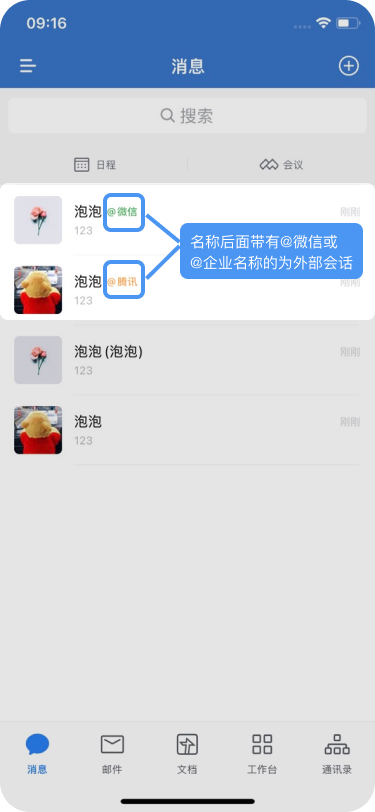 企业微信可以通过电脑端和手机端进行添加外部联系人。外部联系人比较显著的标志是联系人名称后会带有@后缀显示,如下图: