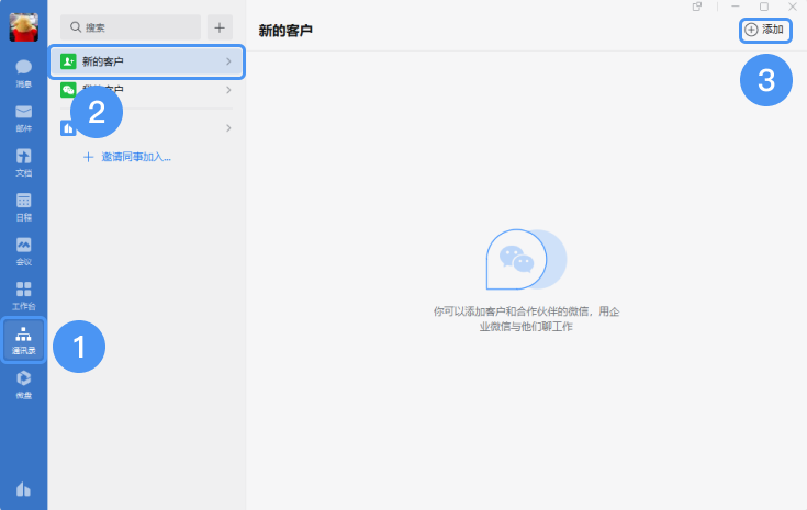 1、企业微信侧添加添加外部联系人步骤(电脑端):登录电脑端企业微信,从“通讯录”——“新的客户”——“添加”,企业微信还支持通过搜索对方的邮箱号进行添加企业微信用户,企业微信的添加好友方式和微信有些许不同,企业微信不支持搜索微信号添加外部联系人。