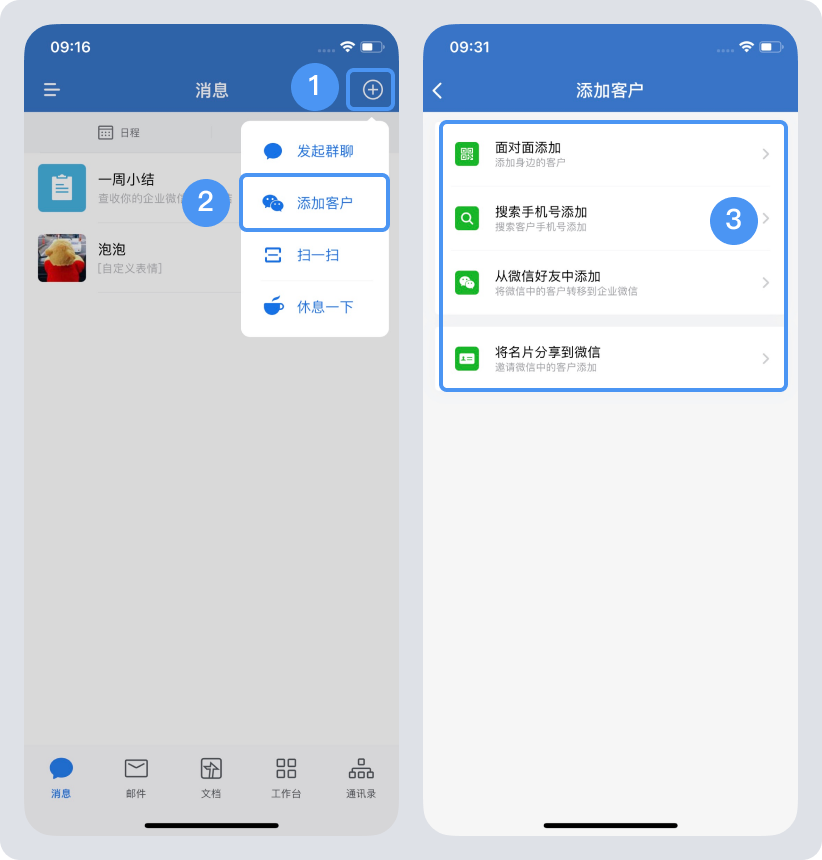 2、企业微信侧添加外部联系人步骤(手机端):手机端打开企业微信,在消息页面右上角,点击“+”——“添加客户”,之后可以选择添加客户的方式来添加客户。添加客户方式有:面对面添加、搜索手机号添加、从微信好友中添加,将名片分享到微信进行添加。