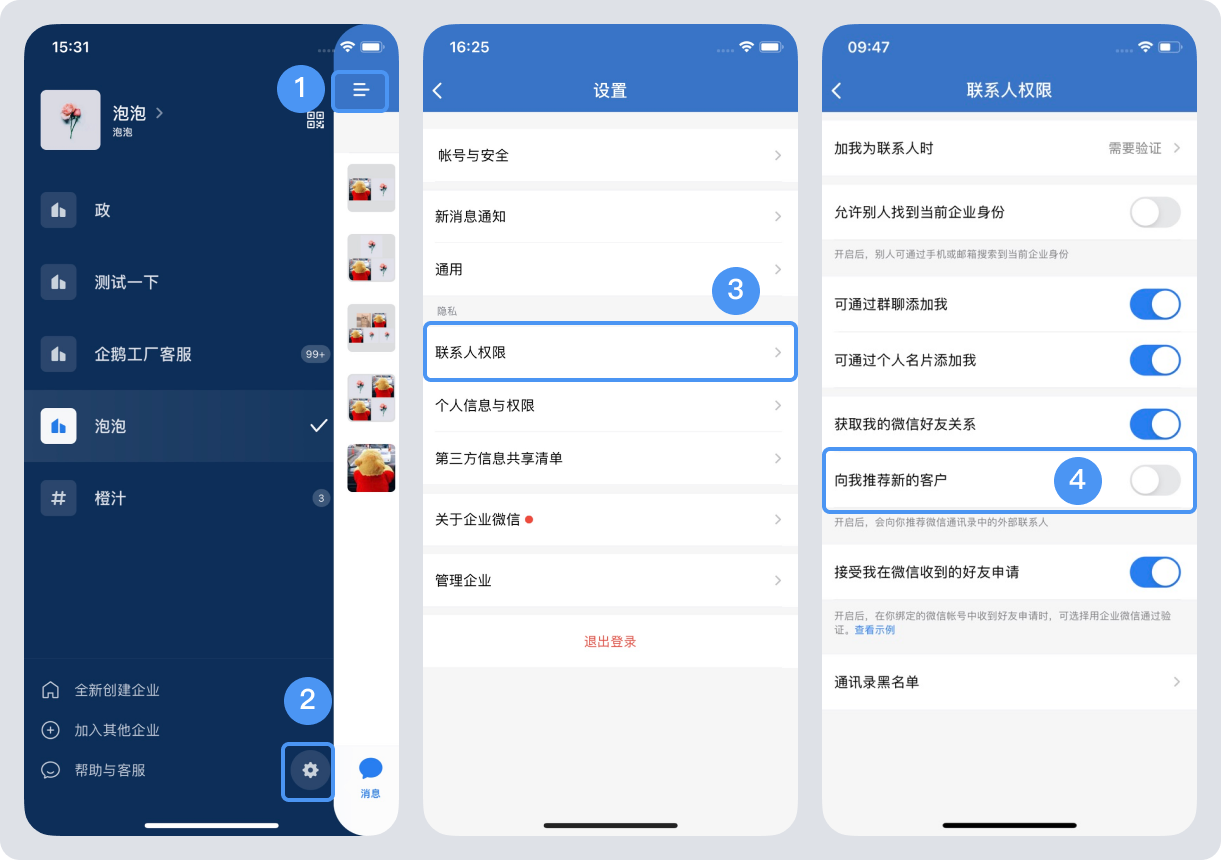 6、通过推荐的微信联系人发起添加好友,就是把联系人里面的某一个权限打开,这个权限就是“想我推荐可能的客户”。开启之后,添加了新的微信联系人,就可以在企业微信“通讯录”——“可能的客户”入口添加微信好友为企业微信好友了。权限开启方式如下图: