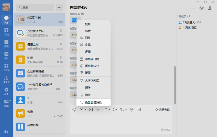 2、企业微信和微信是互通的,与微信好友的单聊或者微信社群的群聊,支持撤回2分钟内发出的消息,超过2分钟时间则不能再撤回。